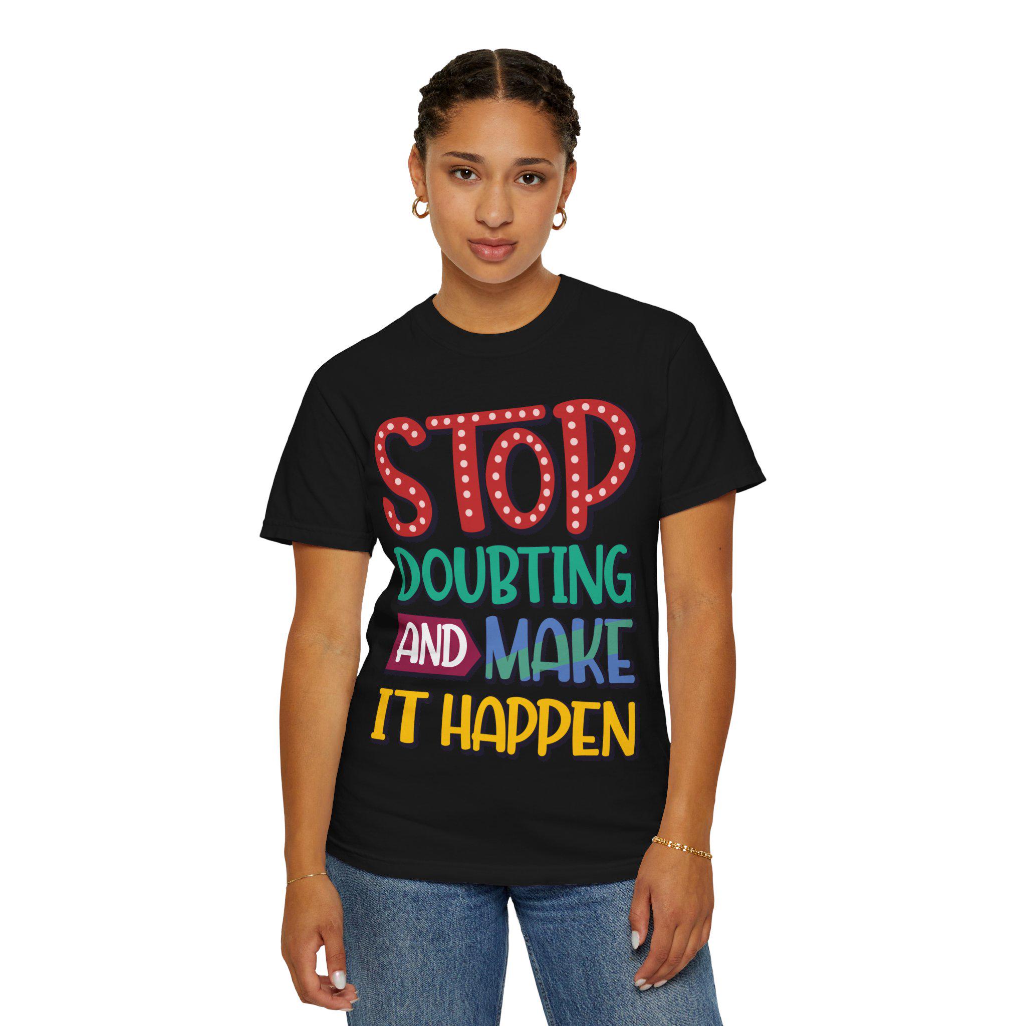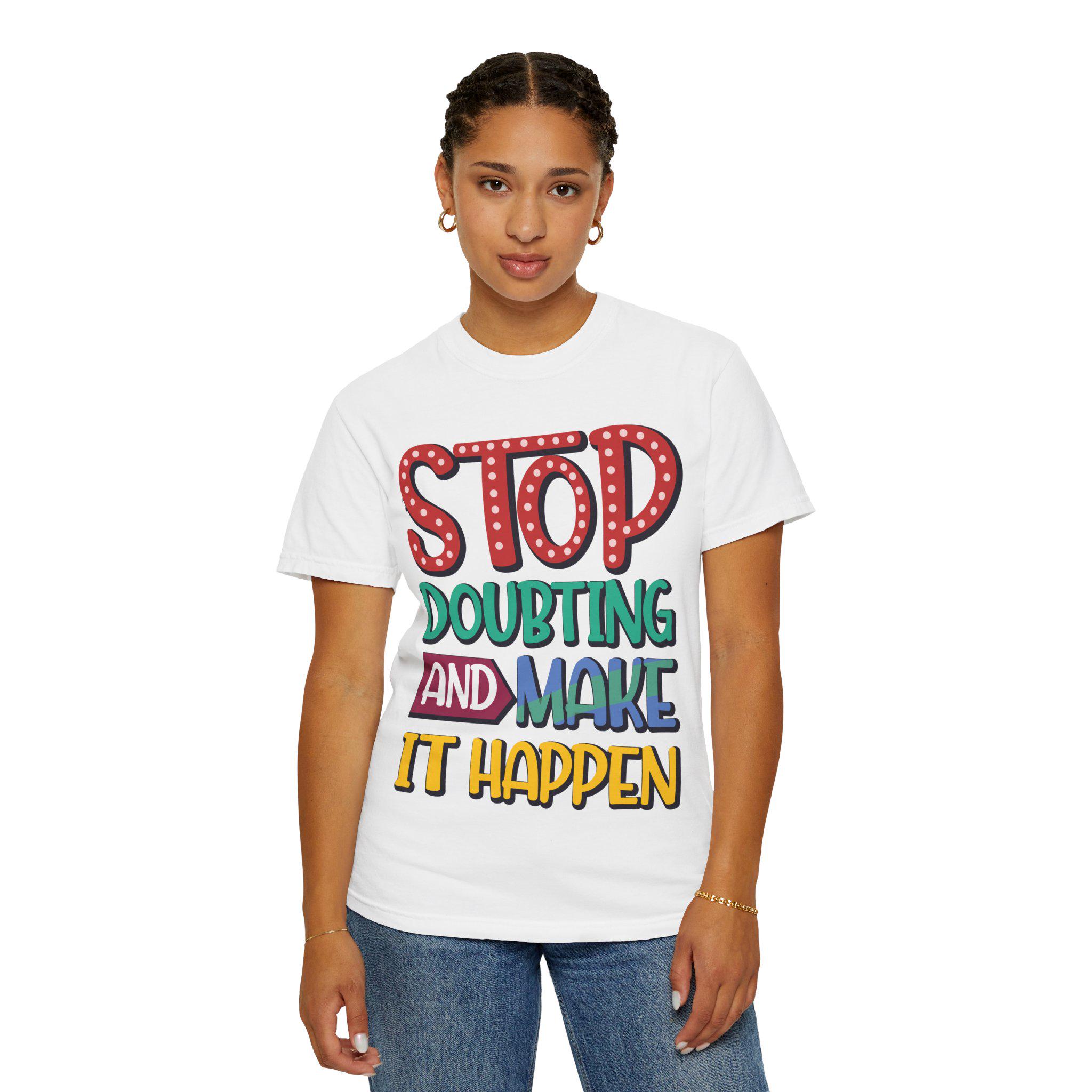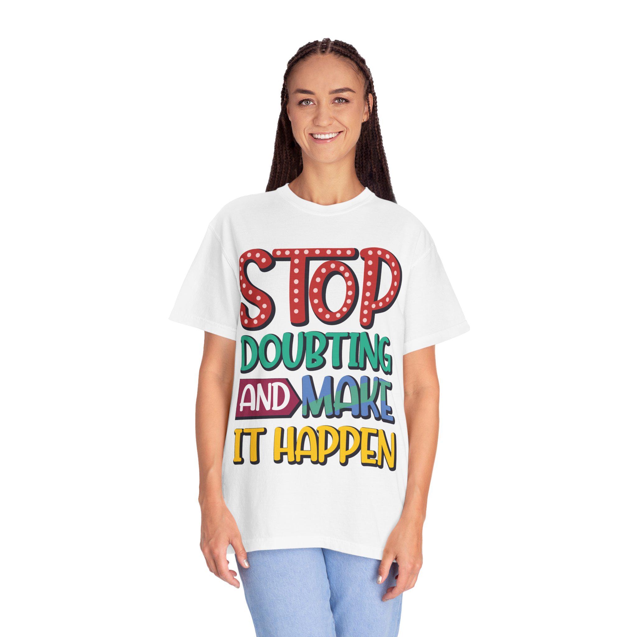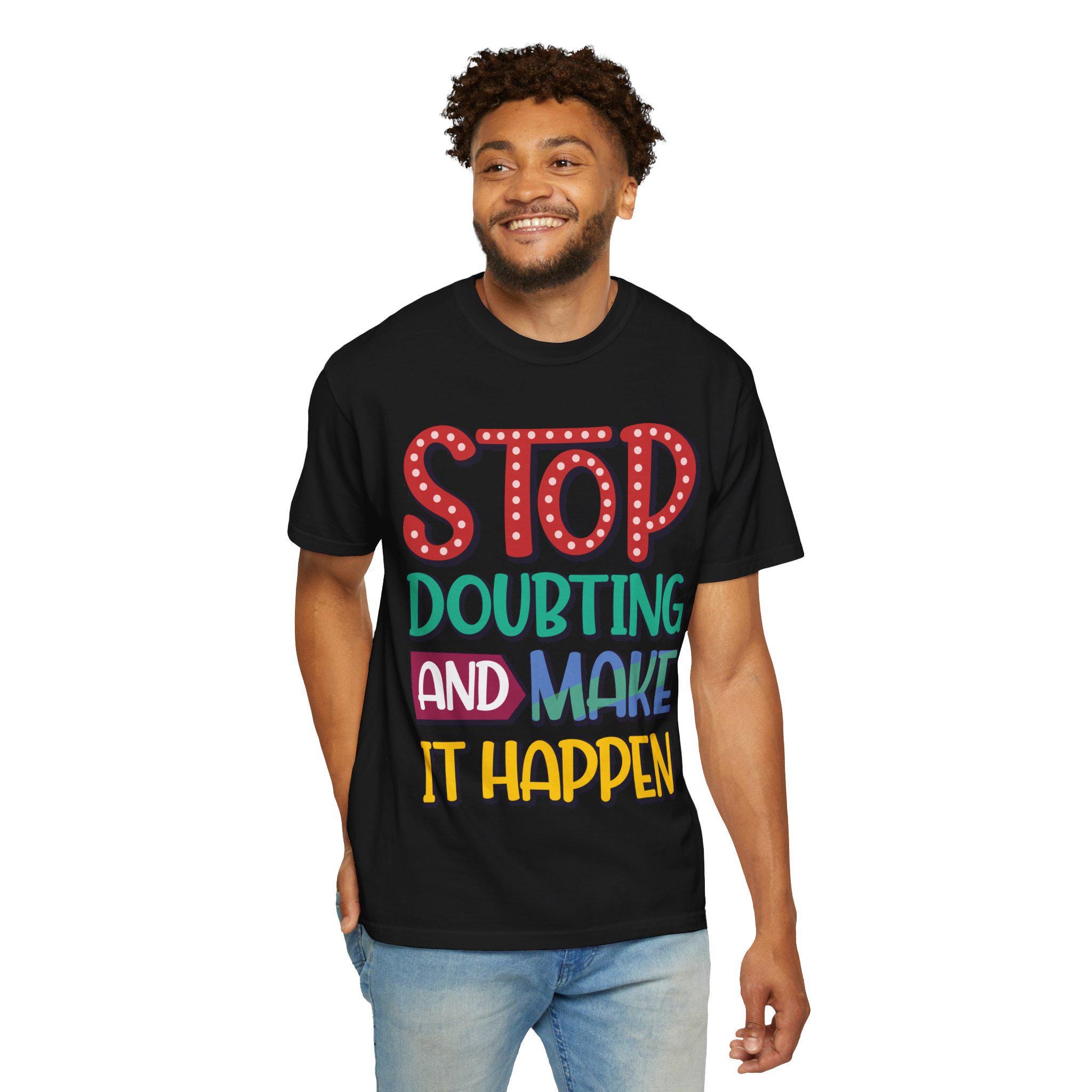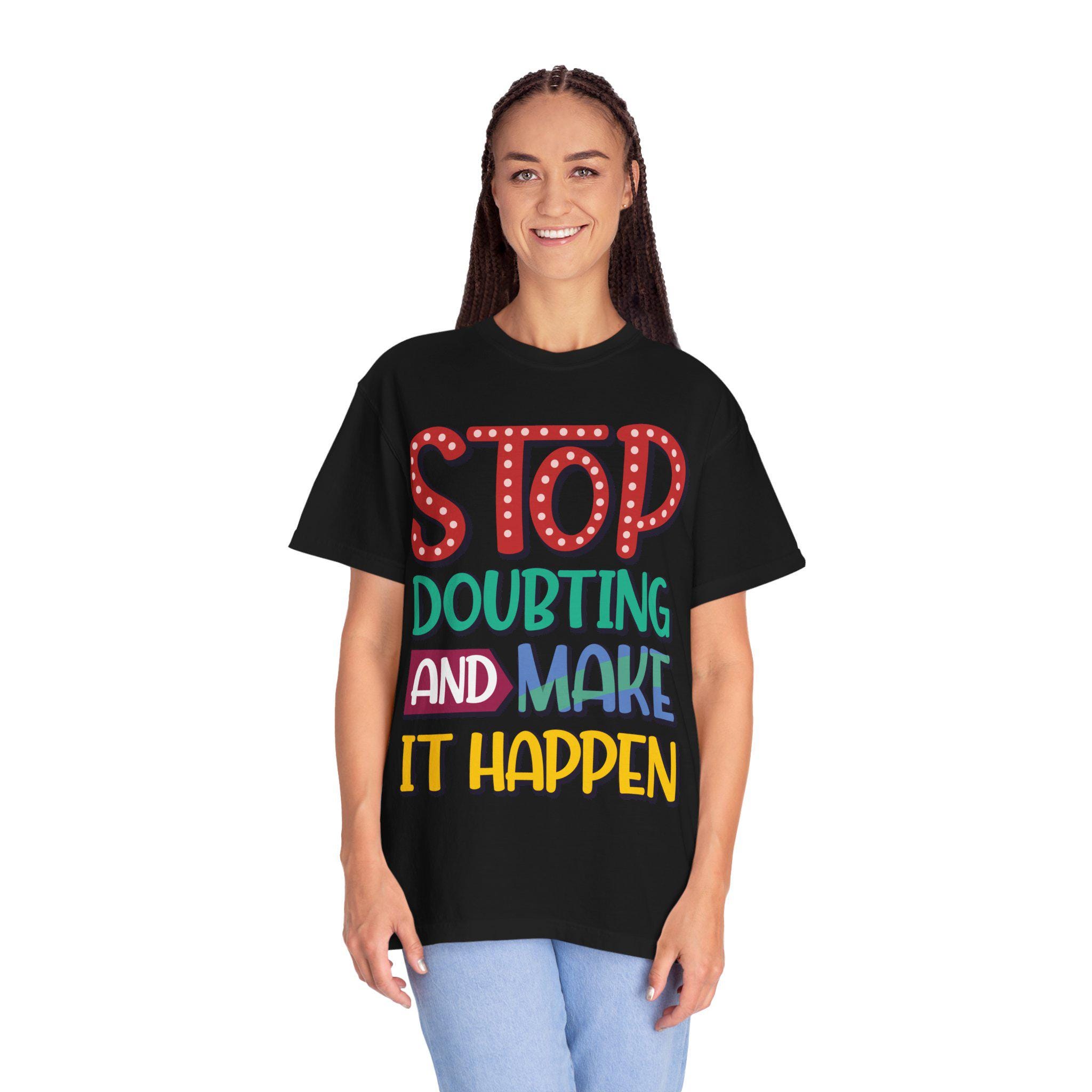 This heavyweight garment-dyed tee feels like a worn-in favorite the moment you pull it on. The relaxed fit and soft, post-dye finish drape easily over layers, while the hand-lettered message — STOP DOUBTING AND MAKE IT HAPPEN — reads like a personal nudge whenever you need one. Built from 100% ring-spun US cotton with double-needle stitching and tubular knit construction, it moves with you and holds its shape through regular wear. Wear it on early-morning runs, studio days, road trips, or when you need a little extra courage before a meeting; the faded, lived-in color and bold lettering blend everyday comfort with confident energy.