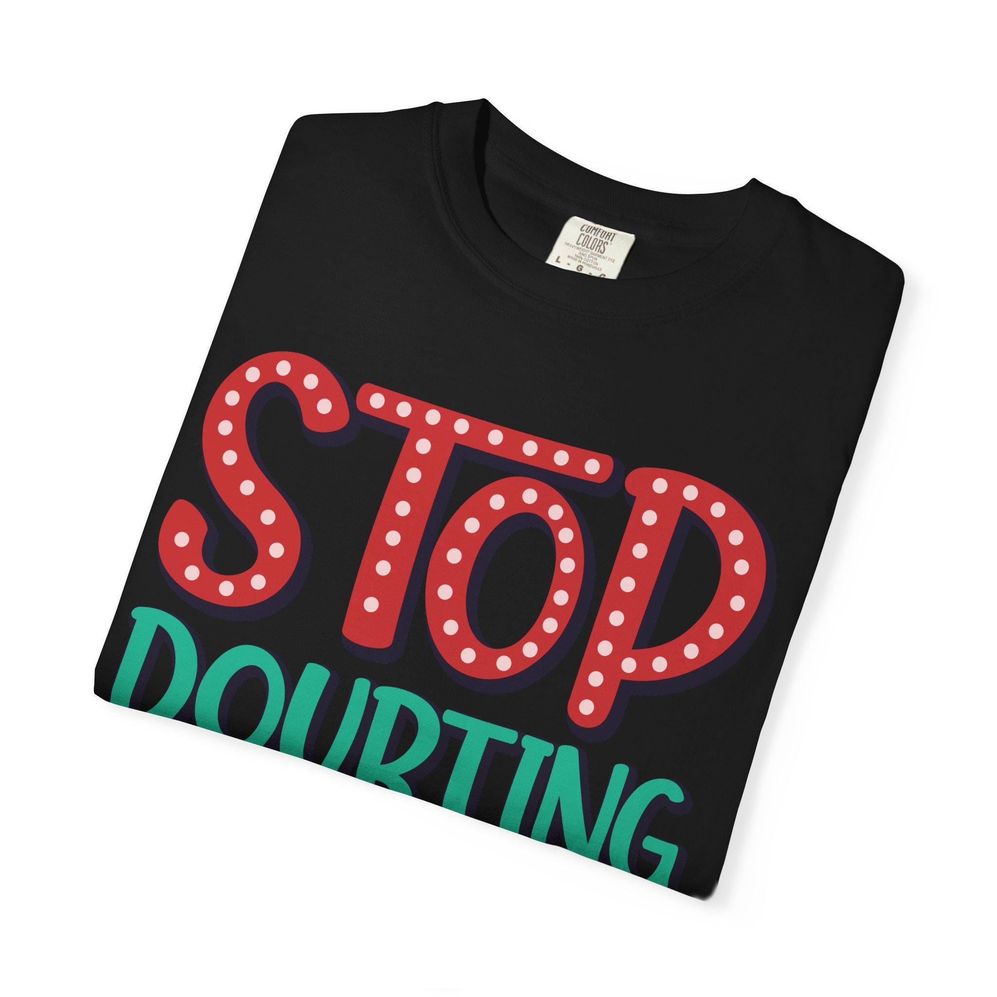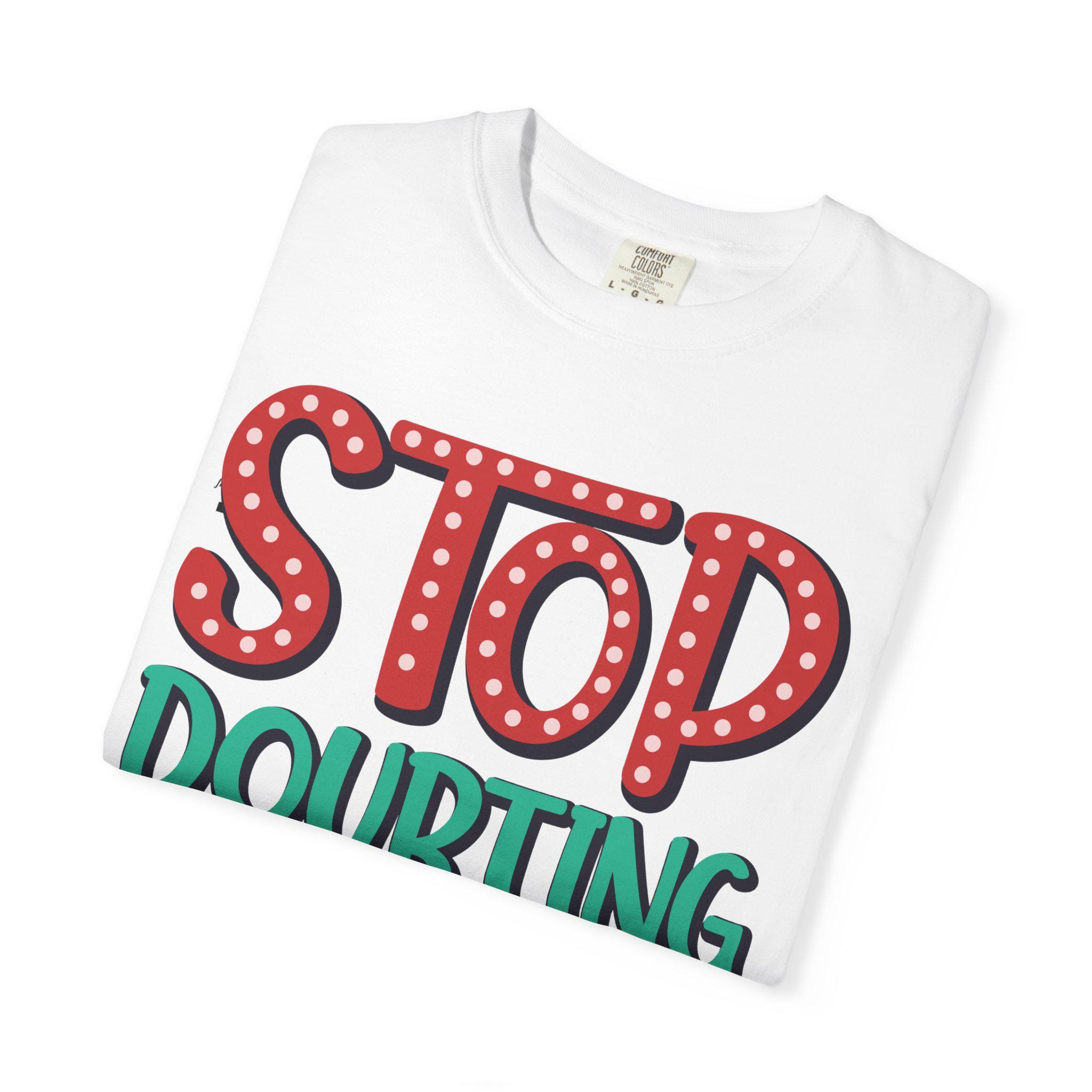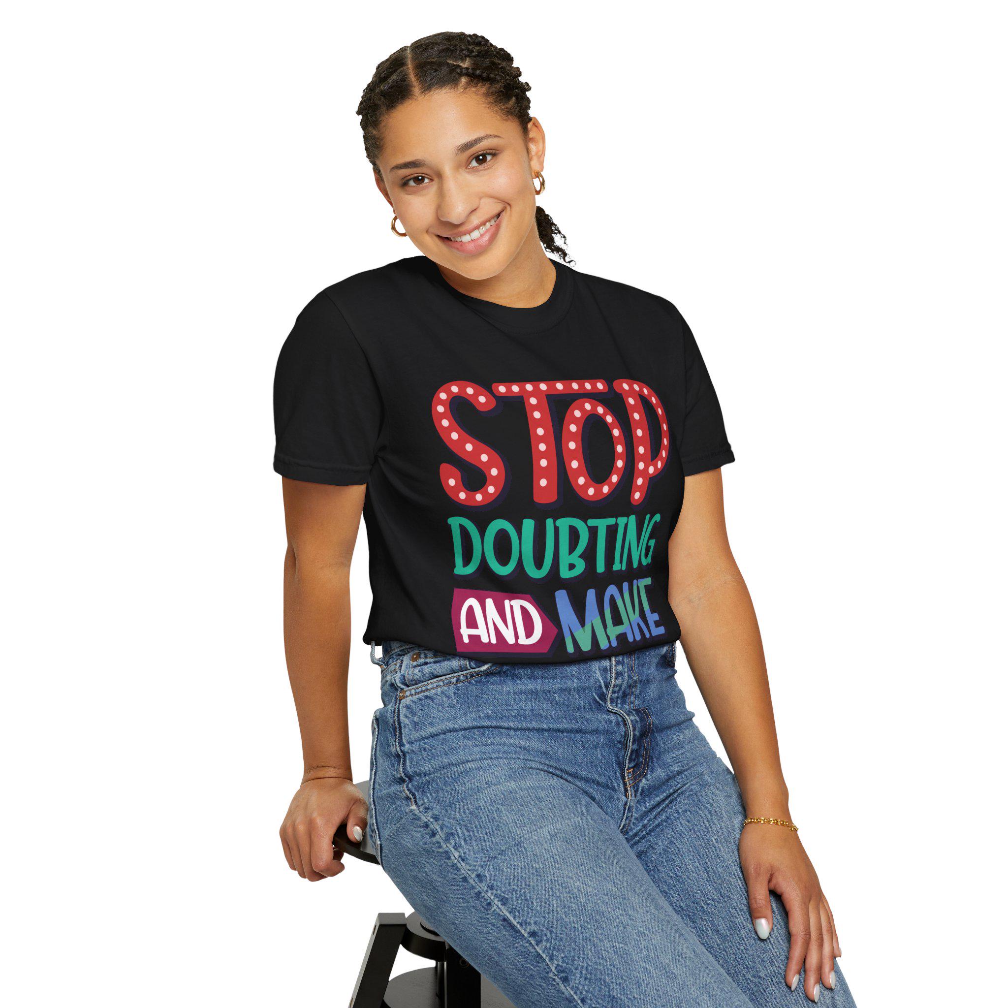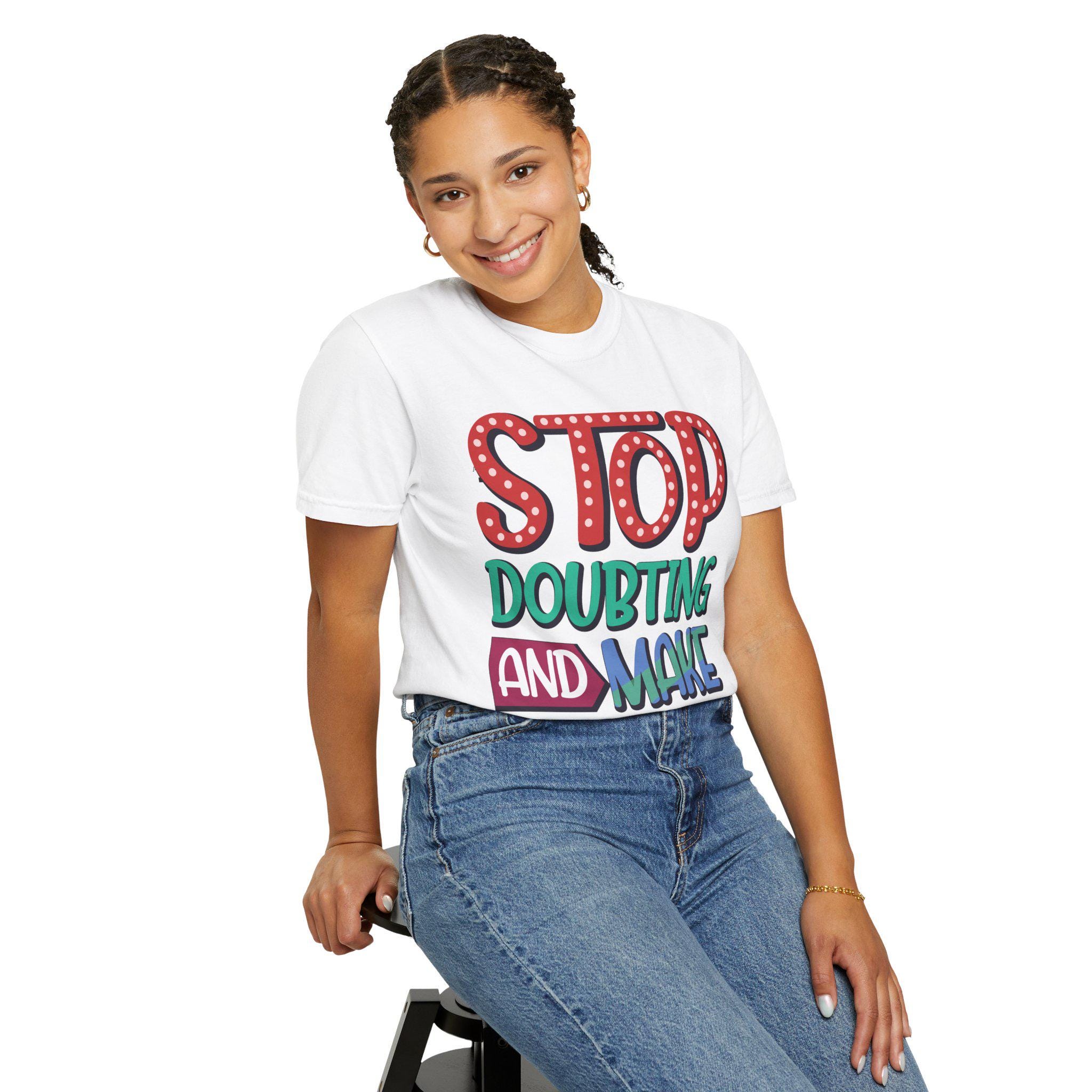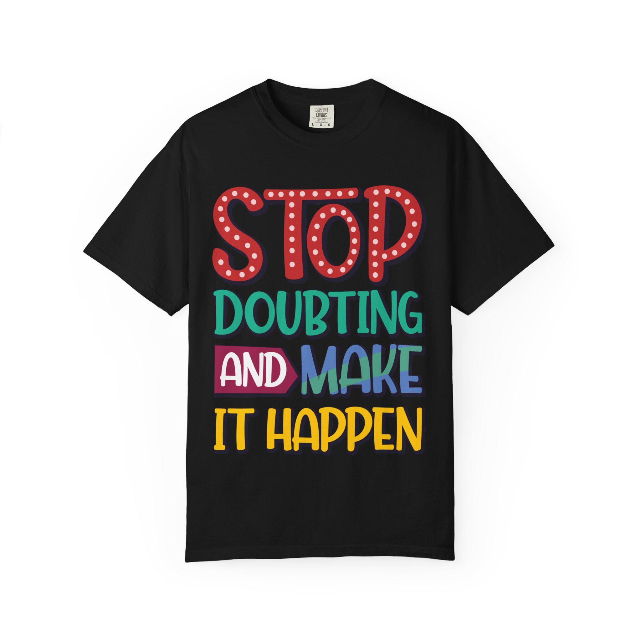 This heavyweight garment-dyed tee feels like a worn-in favorite the moment you pull it on. The relaxed fit and soft, post-dye finish drape easily over layers, while the hand-lettered message — STOP DOUBTING AND MAKE IT HAPPEN — reads like a personal nudge whenever you need one. Built from 100% ring-spun US cotton with double-needle stitching and tubular knit construction, it moves with you and holds its shape through regular wear. Wear it on early-morning runs, studio days, road trips, or when you need a little extra courage before a meeting; the faded, lived-in color and bold lettering blend everyday comfort with confident energy.