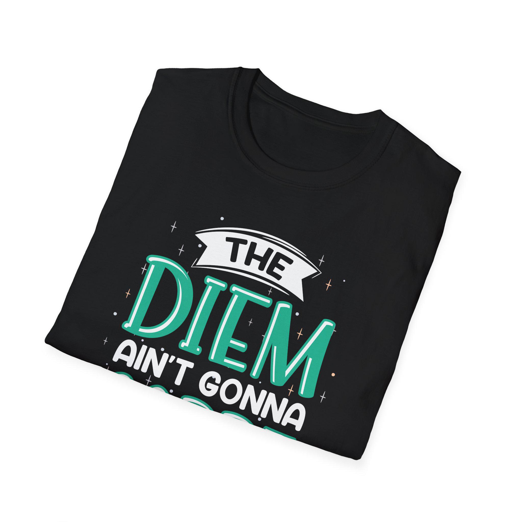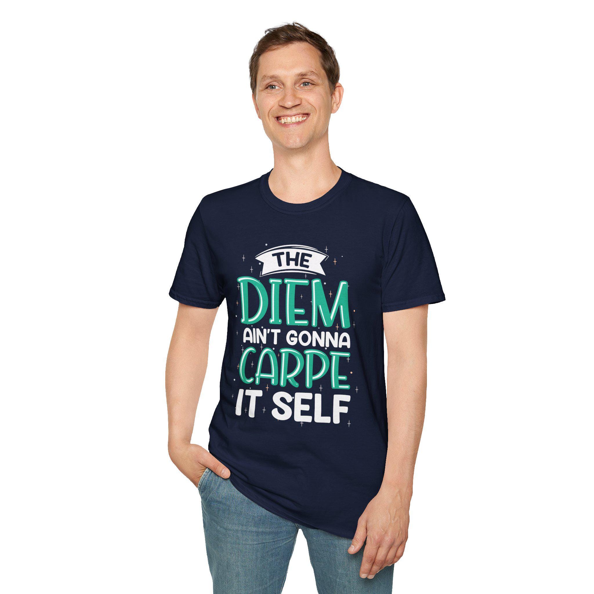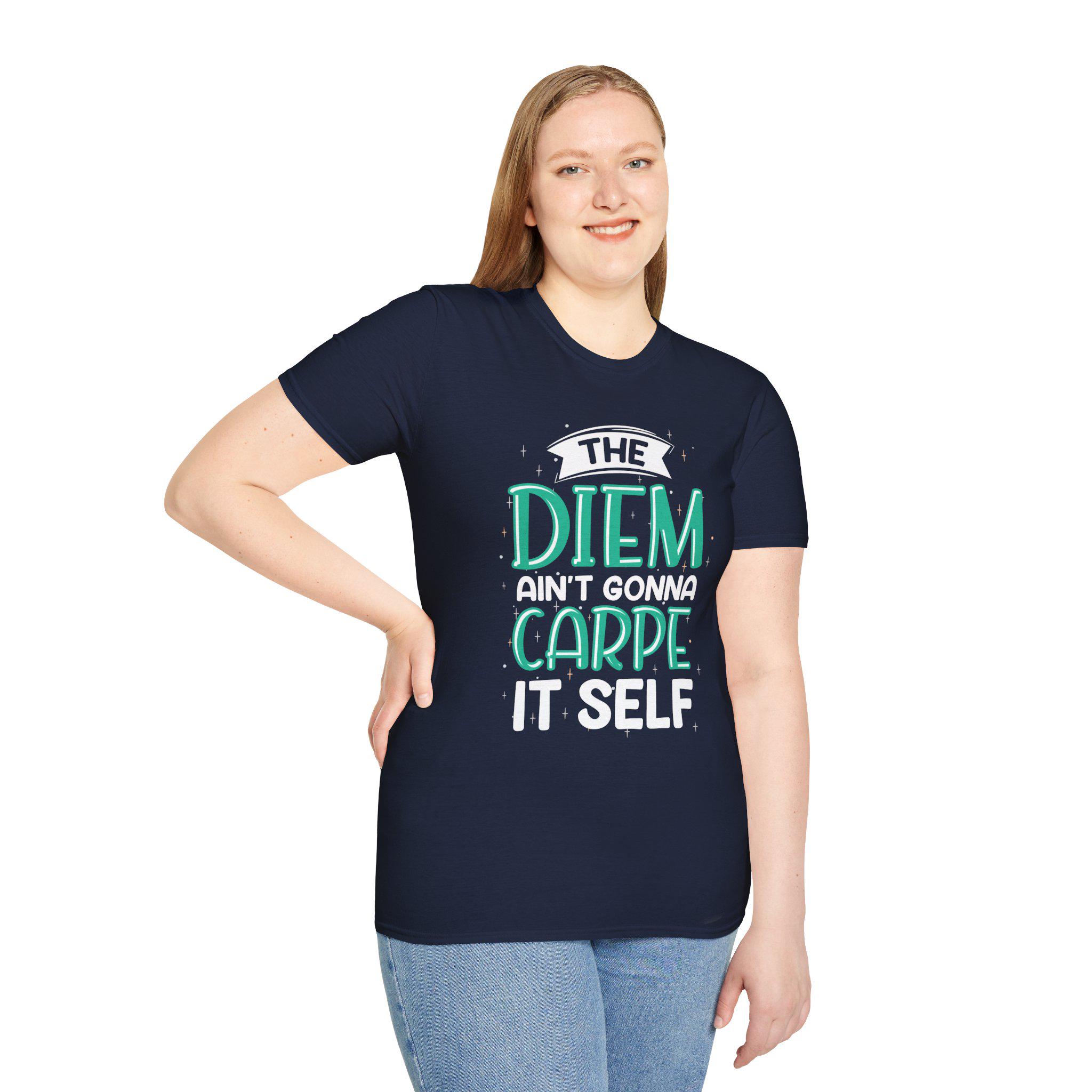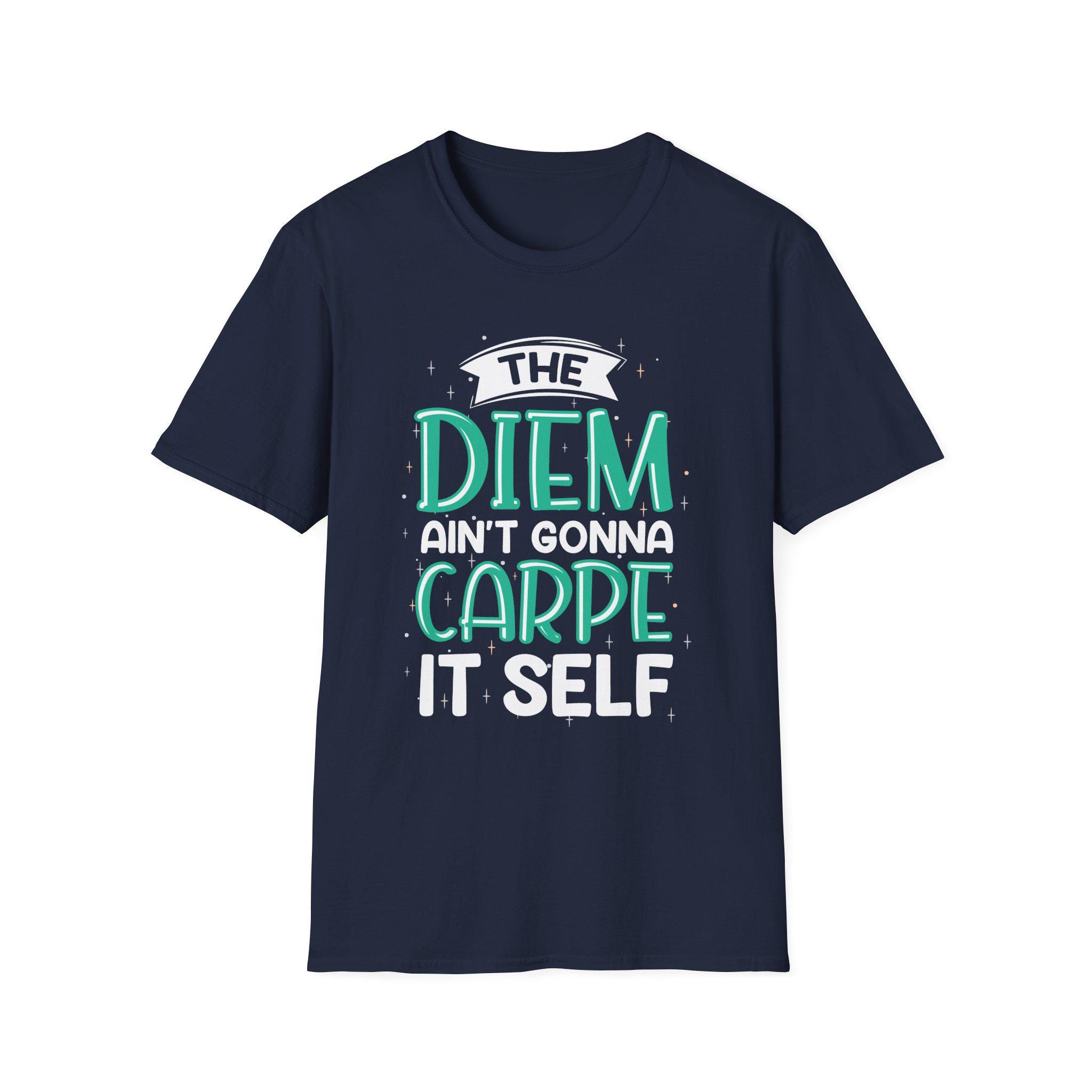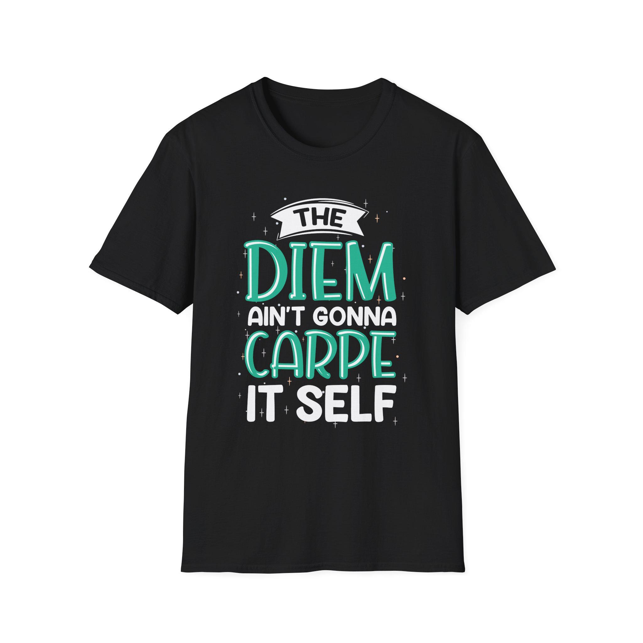 Lightweight, quietly clever, and effortlessly wearable—this cotton tee reads like a private joke for early risers and slow-starters alike. The hand-lettered slogan, “The Diem Ain’t Gonna Carpe It Self,” sits in playful teal and white against a warm, naturally flecked fabric. It drapes softly at the shoulders and keeps a clean crew silhouette whether layered under a jacket or thrown over a hoodie. Reach for it on rushed mornings as a wry nudge to move, or wear it to low-key meet-ups when you want to wink instead of shout. The smooth print and lived-in texture make it feel familiar from the first wear, while subtle details—like the tear-away label and stable shoulder tape—keep it honest and comfortable day after day.