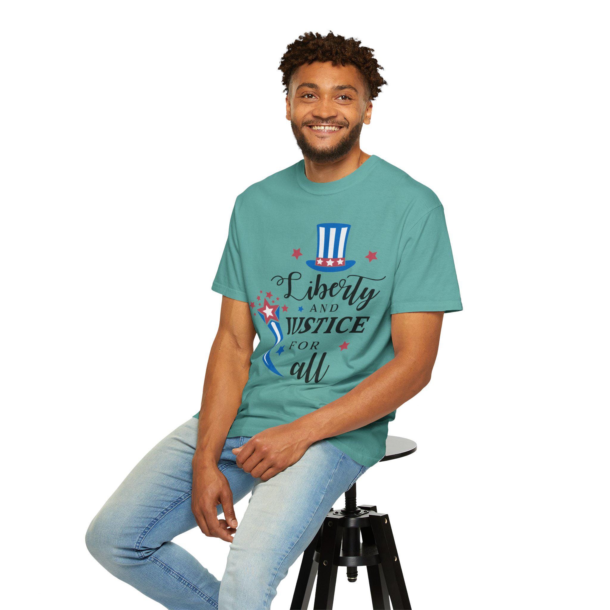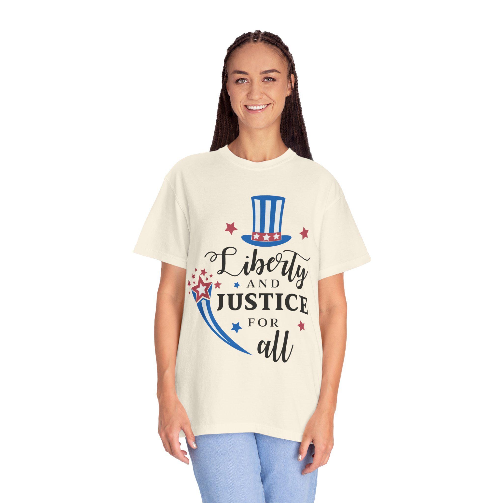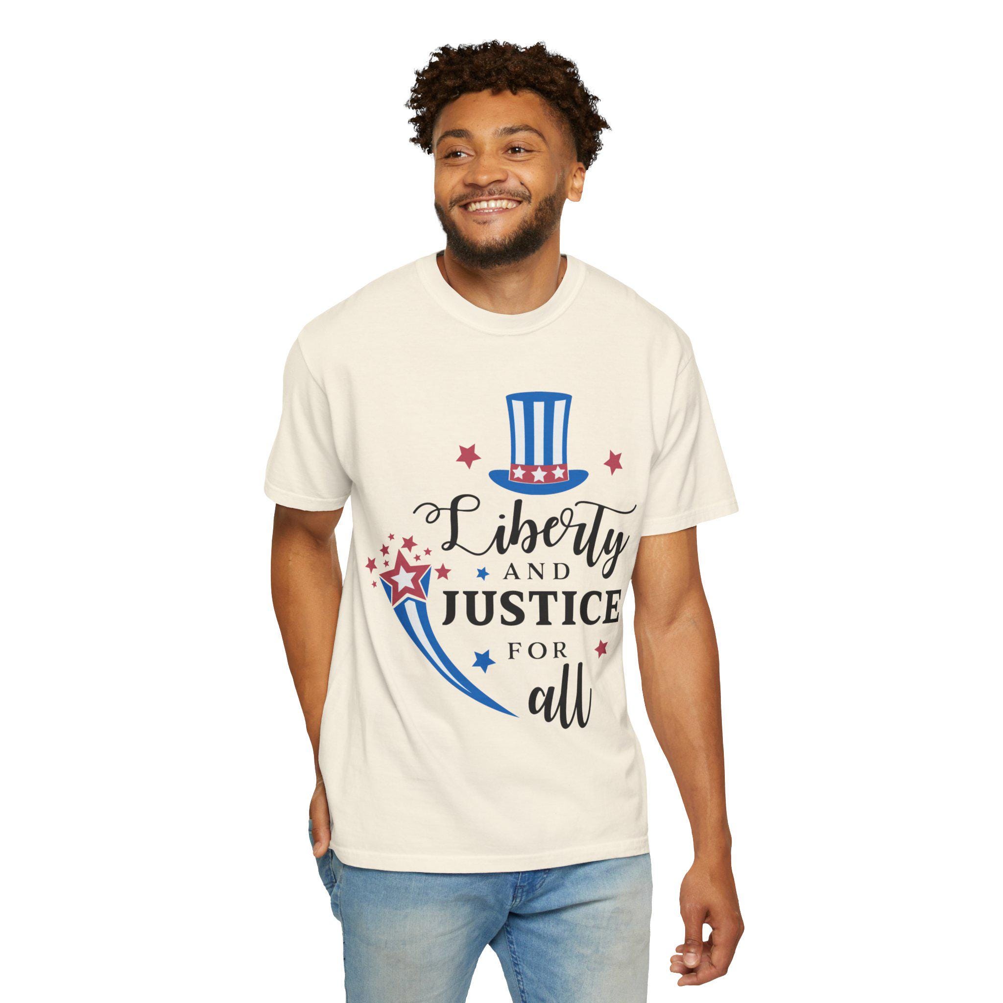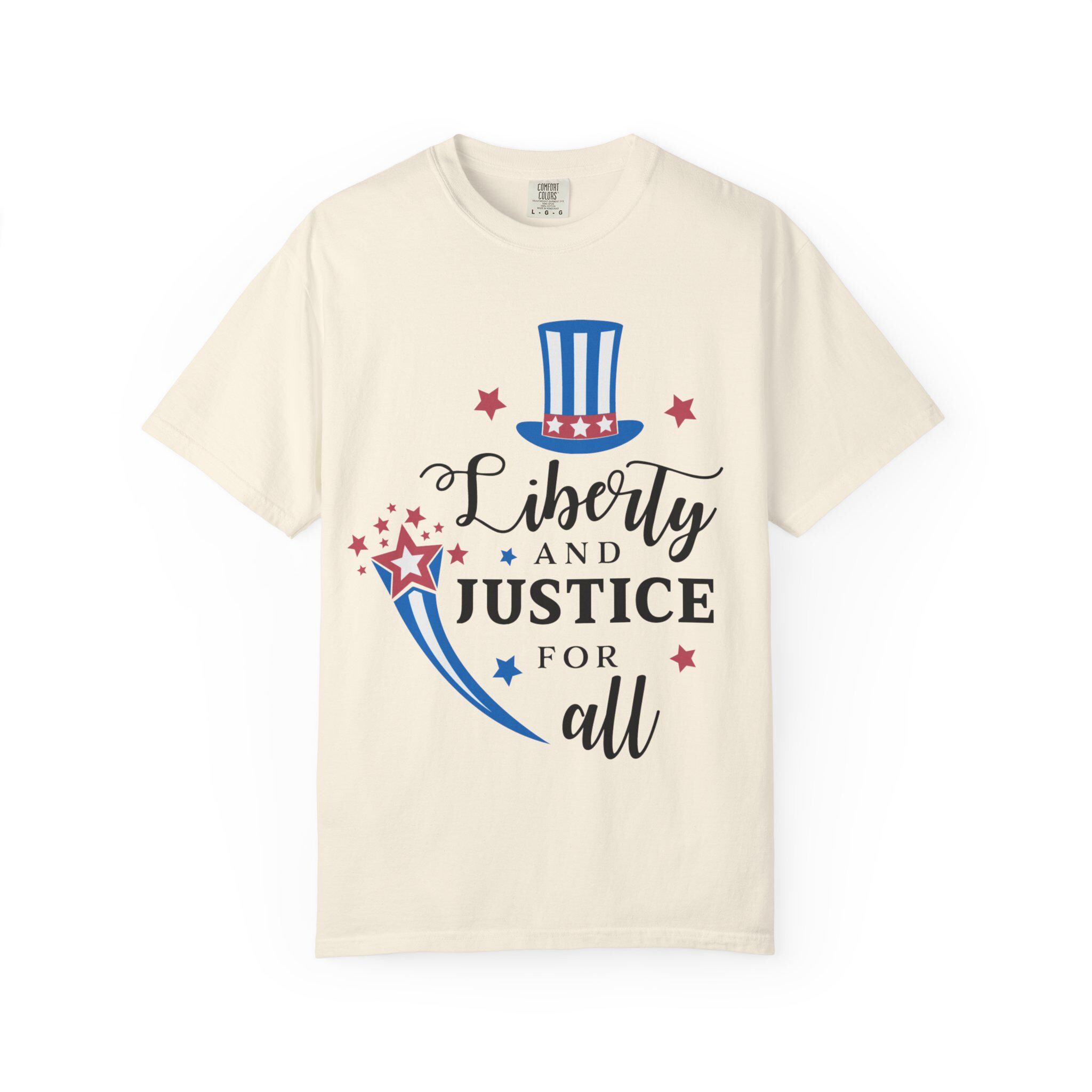 This garment-dyed tee settles like a familiar voice in your wardrobe — soft, substantial, and quietly expressive. The muted, hand-dyed color and vintage texture let the message of liberty and justice for all come through with calm confidence. A stylized top hat, star accents, and flowing script sit naturally on the lived-in fabric, so the graphic feels like part of the shirt’s story rather than an announcement. Wear it while chatting on the porch, marching in neighborhood parades, or helping out at volunteer events; it layers easily for cool summer nights at fireworks or backyard gatherings and holds up season after season. The relaxed fit and durable construction make it the kind of shirt you reach for again and again when you want to look grounded and speak up without shouting.