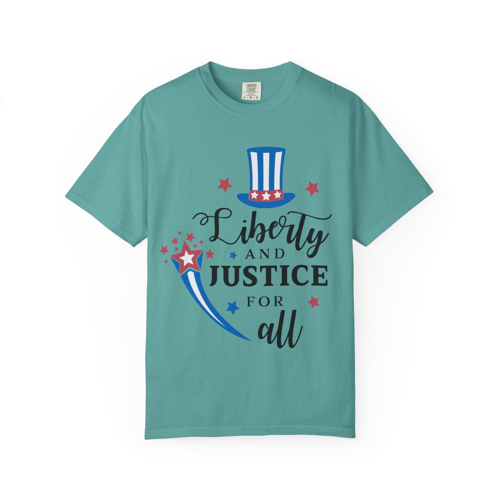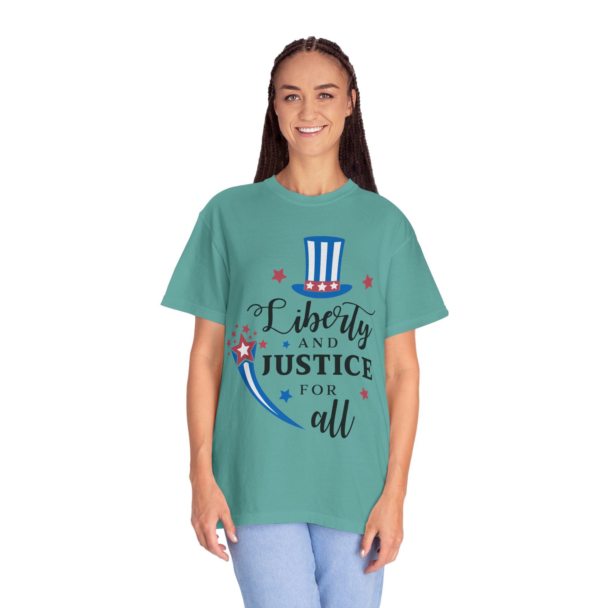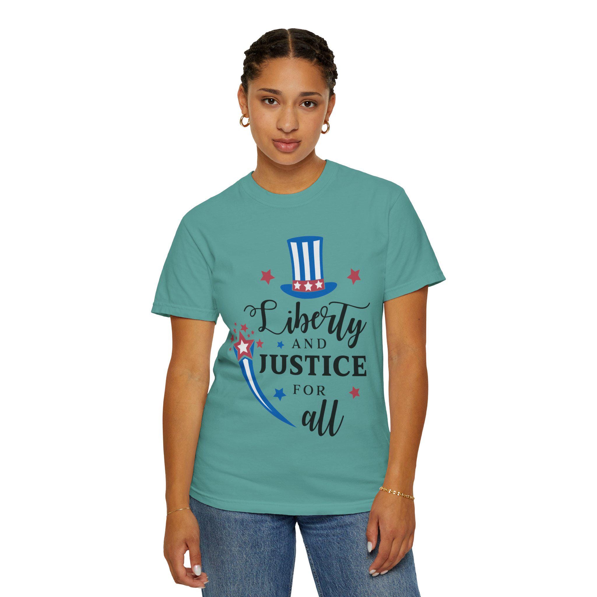 This garment-dyed tee settles like a familiar voice in your wardrobe — soft, substantial, and quietly expressive. The muted, hand-dyed color and vintage texture let the message of liberty and justice for all come through with calm confidence. A stylized top hat, star accents, and flowing script sit naturally on the lived-in fabric, so the graphic feels like part of the shirt’s story rather than an announcement. Wear it while chatting on the porch, marching in neighborhood parades, or helping out at volunteer events; it layers easily for cool summer nights at fireworks or backyard gatherings and holds up season after season. The relaxed fit and durable construction make it the kind of shirt you reach for again and again when you want to look grounded and speak up without shouting.