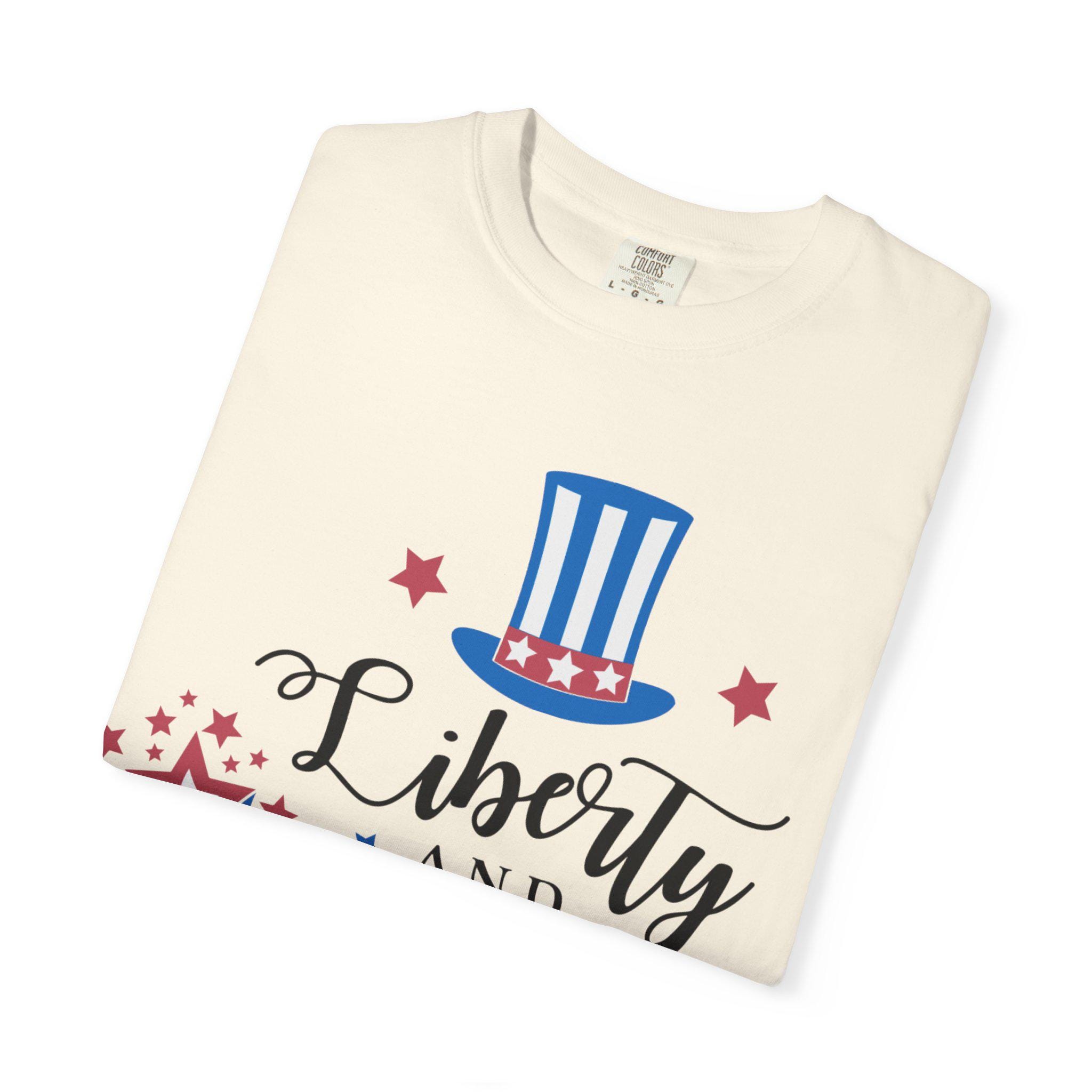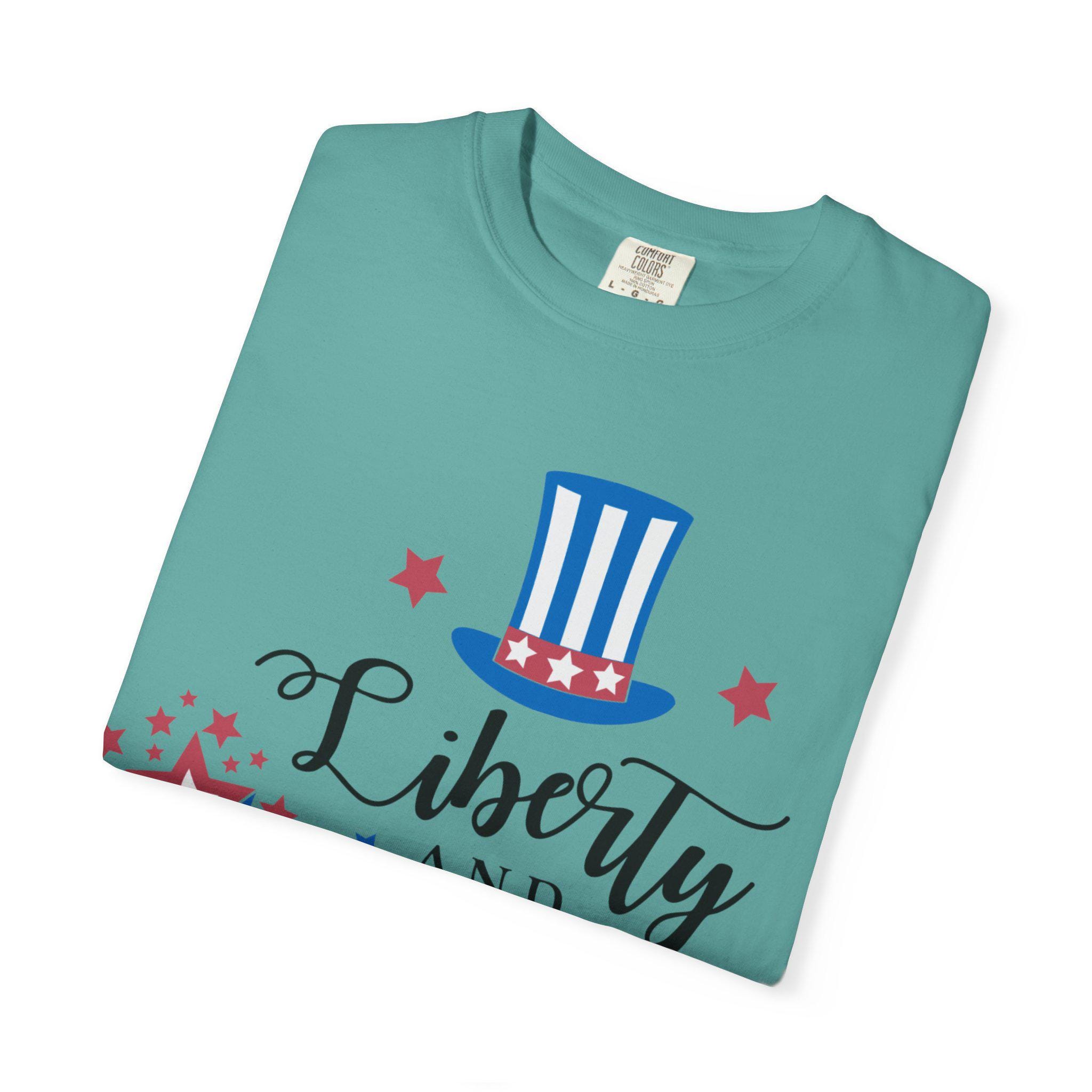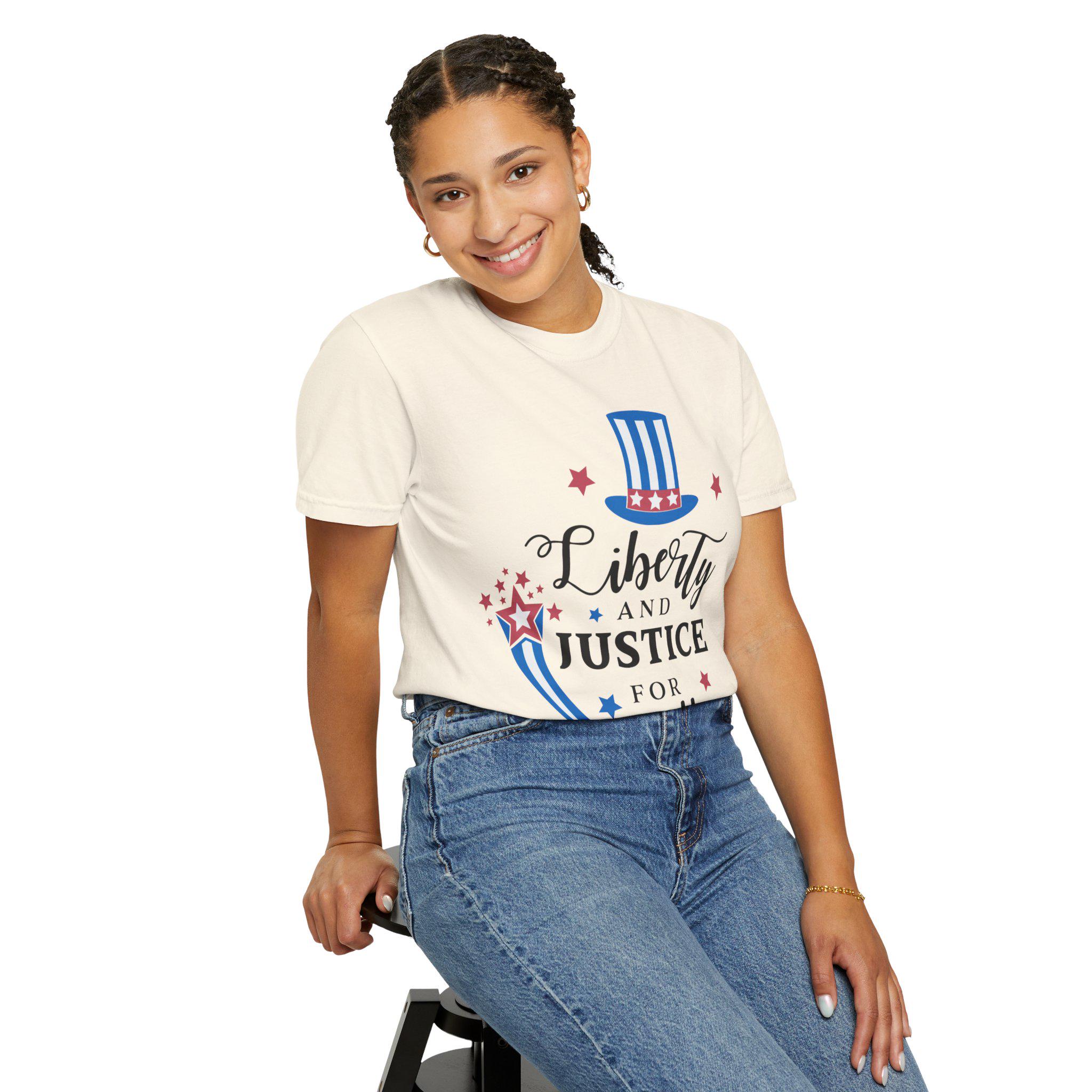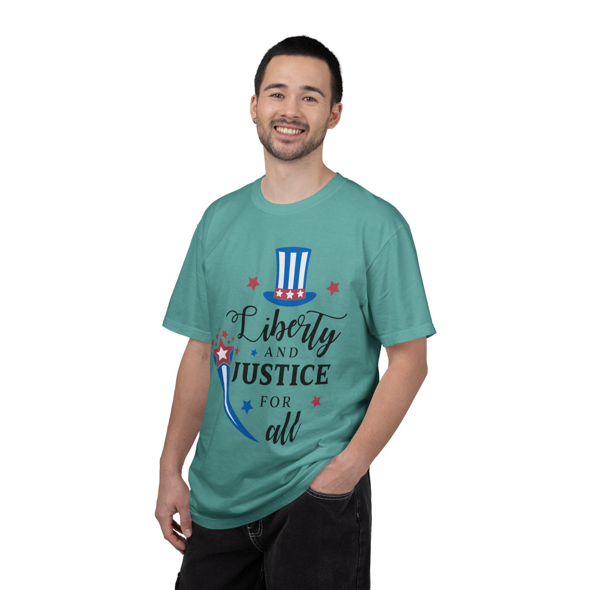 This garment-dyed tee settles like a familiar voice in your wardrobe — soft, substantial, and quietly expressive. The muted, hand-dyed color and vintage texture let the message of liberty and justice for all come through with calm confidence. A stylized top hat, star accents, and flowing script sit naturally on the lived-in fabric, so the graphic feels like part of the shirt’s story rather than an announcement. Wear it while chatting on the porch, marching in neighborhood parades, or helping out at volunteer events; it layers easily for cool summer nights at fireworks or backyard gatherings and holds up season after season. The relaxed fit and durable construction make it the kind of shirt you reach for again and again when you want to look grounded and speak up without shouting.