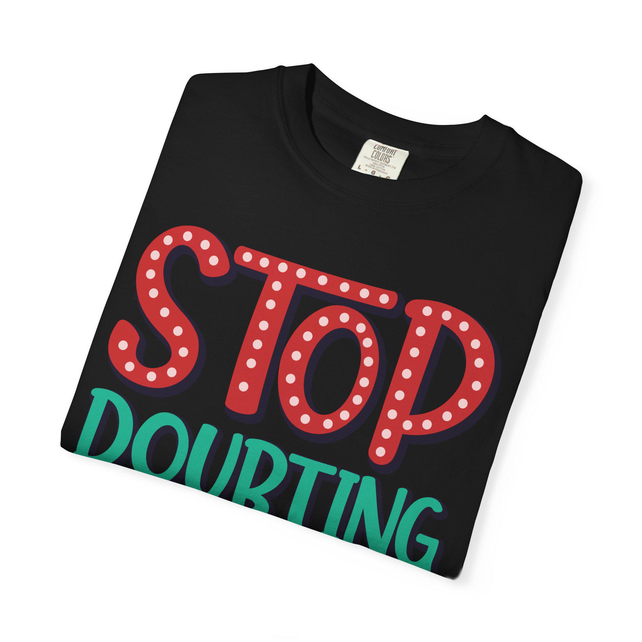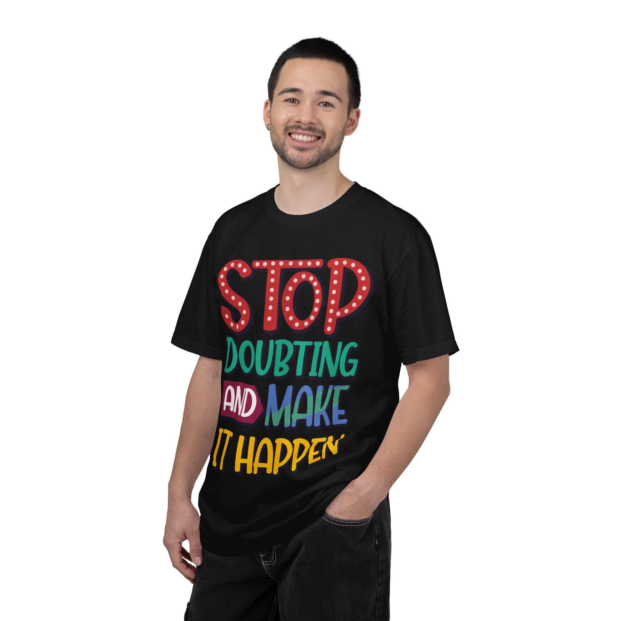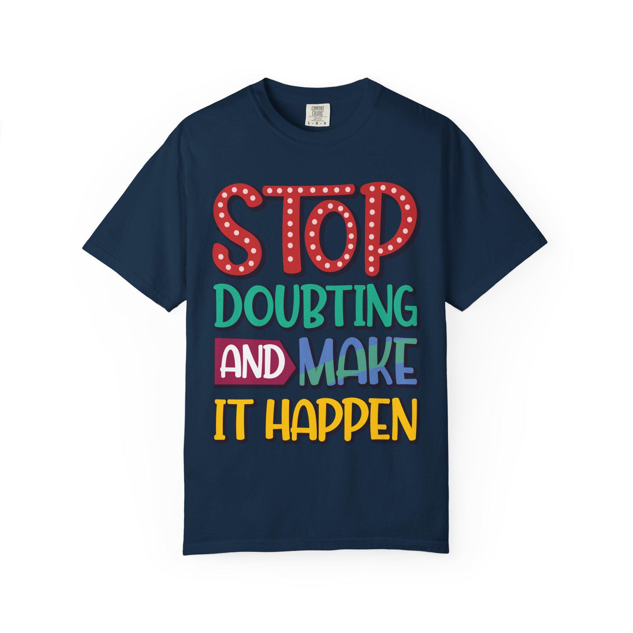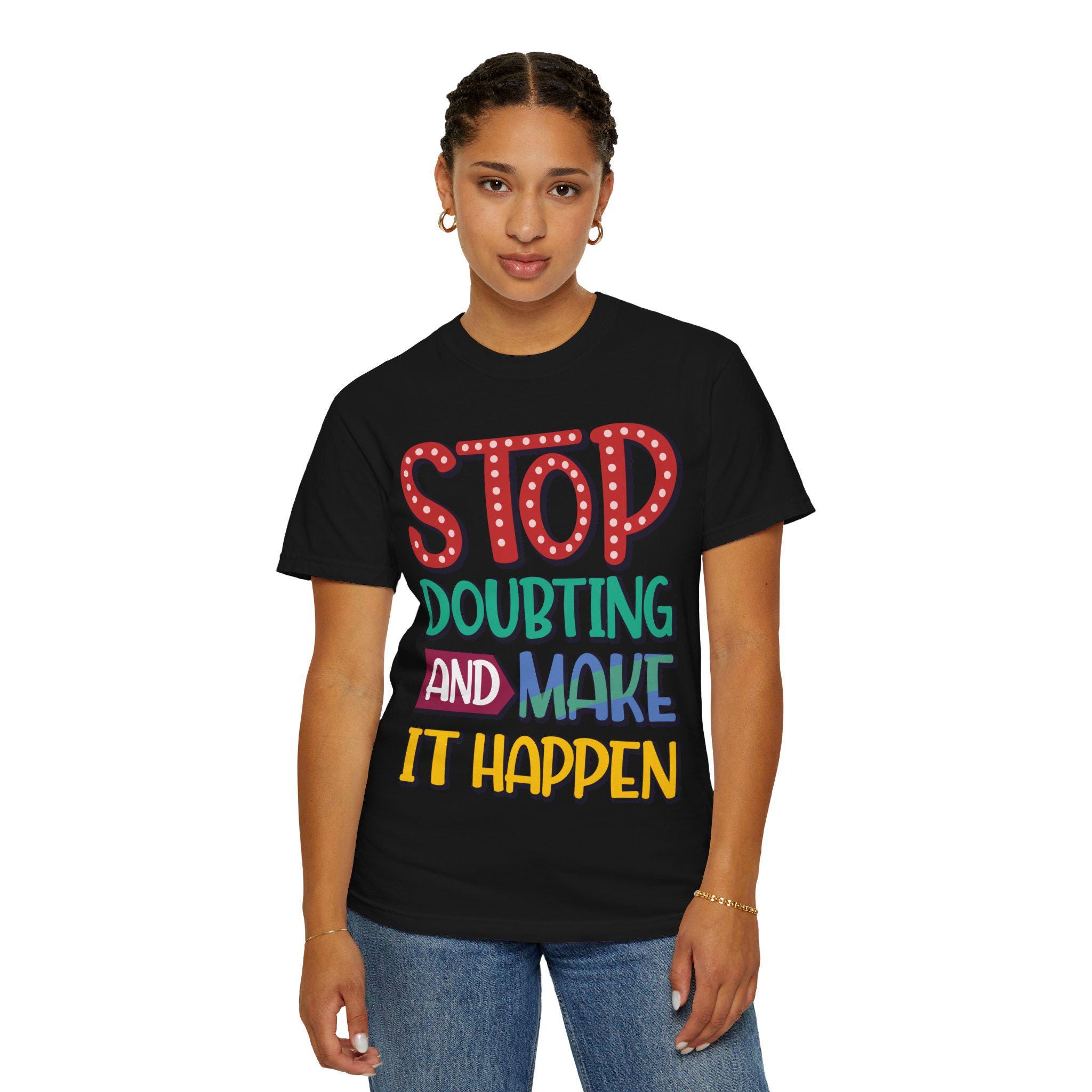 This heavyweight garment-dyed tee feels like a pep talk you can wear. Bold, hand-lettered text declares “Stop Doubting and Make It Happen” across a soft, vintage-hued surface that only gets better with time. The relaxed, sturdy cut sits comfortably through long days — layer it under a jacket for pre-dawn hustle or pull it on solo when you need a gritty nudge to keep moving. The color is lived-in from the start, the fabric breaks in with you, and the construction is built to last so the message stays loud even as the tee acquires its own story.