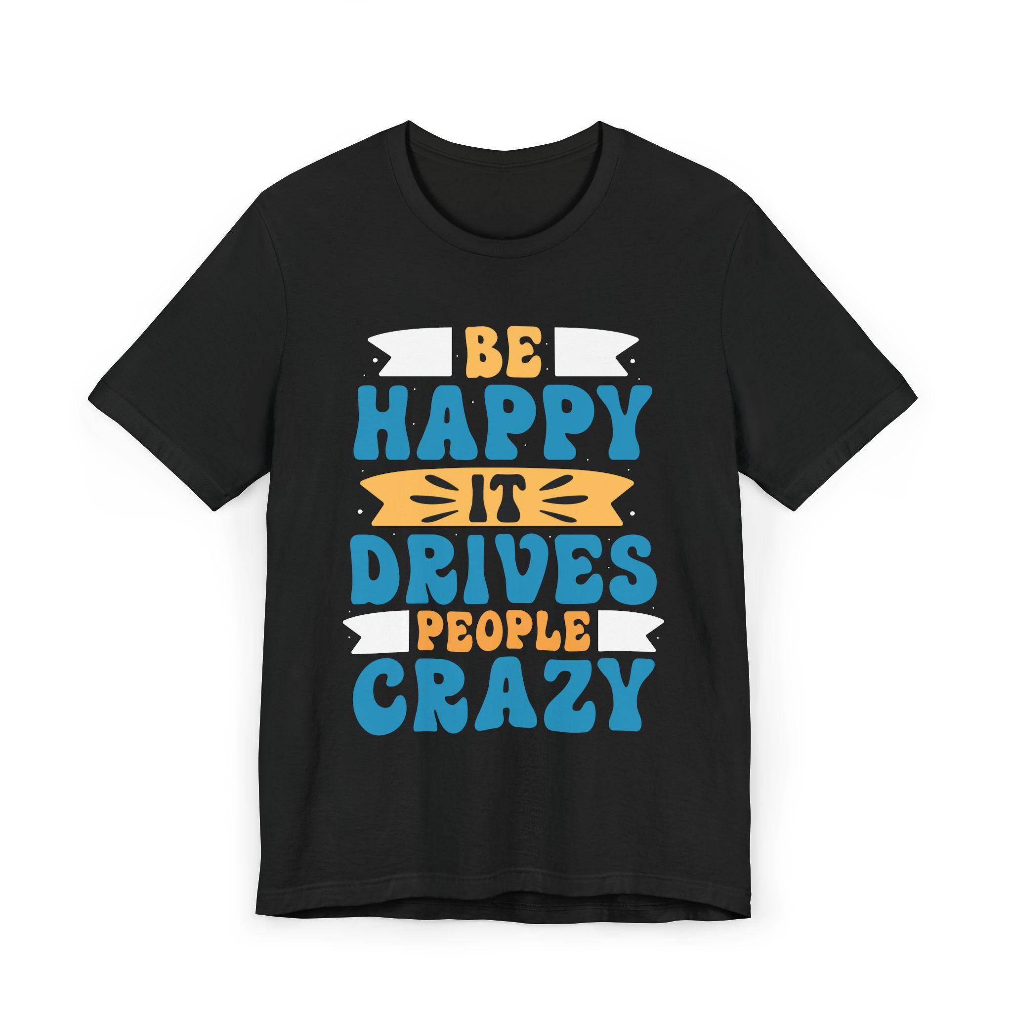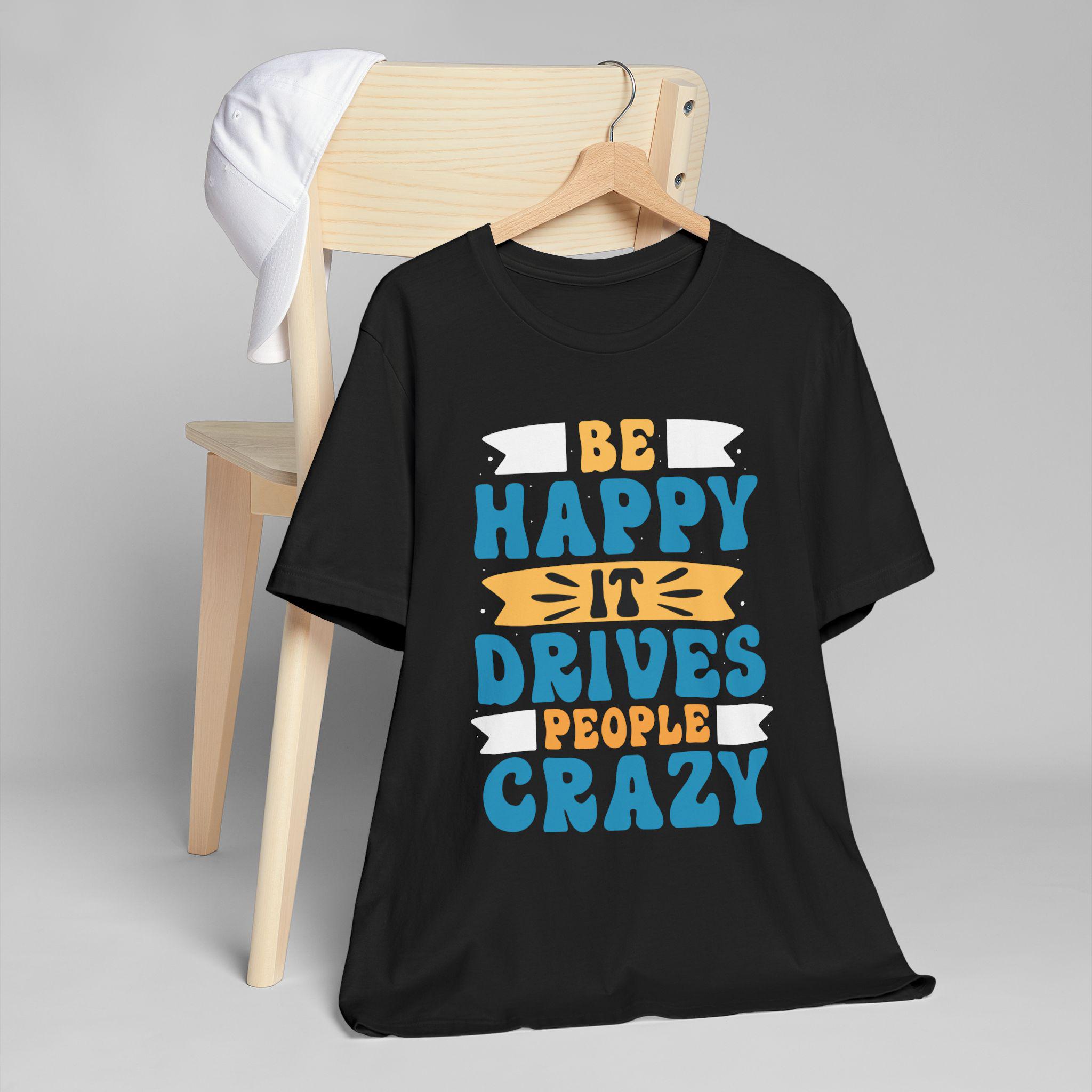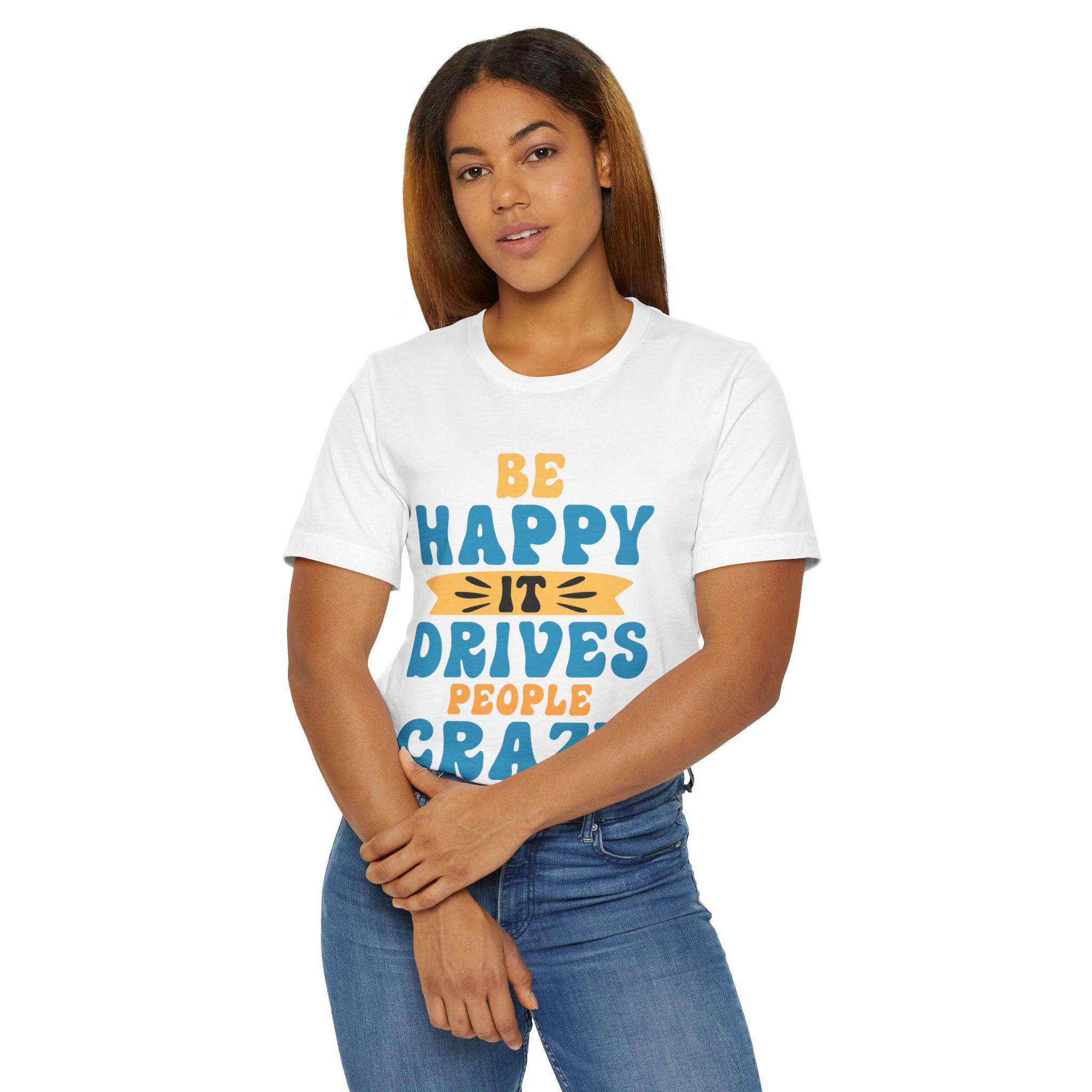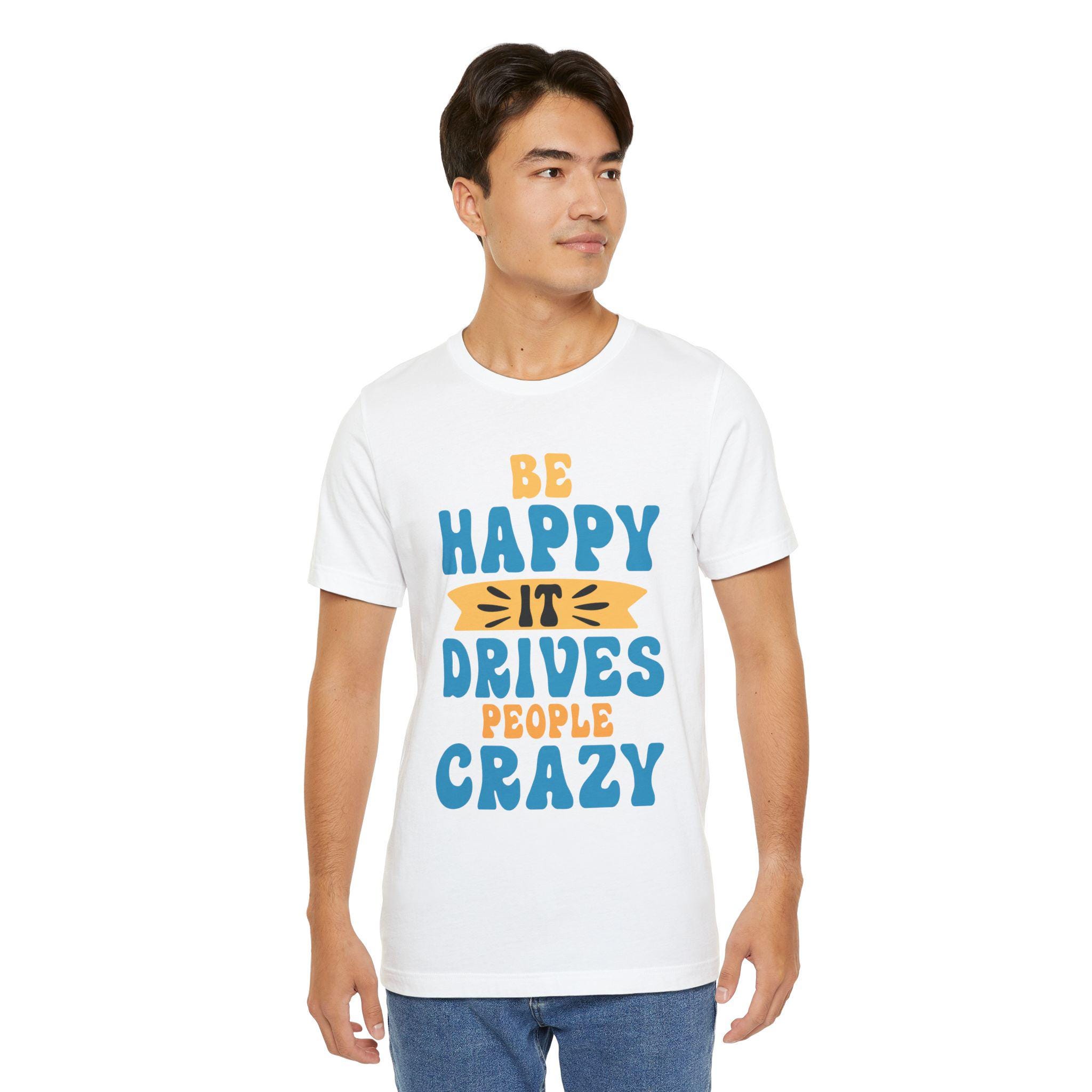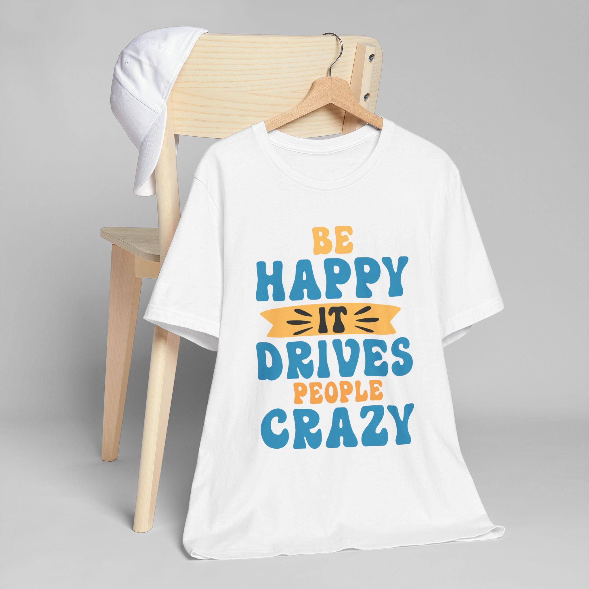 This lightweight tee radiates sunny mischief. Hand-lettered script proclaims “Be happy it drives people crazy,” offset by a warm, sunlit accent that reads like a wink. It sits easy on the body with a relaxed retail fit and a classic crew neckline, so it layers neatly under jackets or stands alone on slow weekend mornings and coffee runs. Breathable, ultra-light cotton keeps you cool while the ribbed collar and shoulder tape hold shape through washes. Wear it when you want to lift the room’s mood with a little playful confidence — casual, cheeky, and comfortably lived-in.