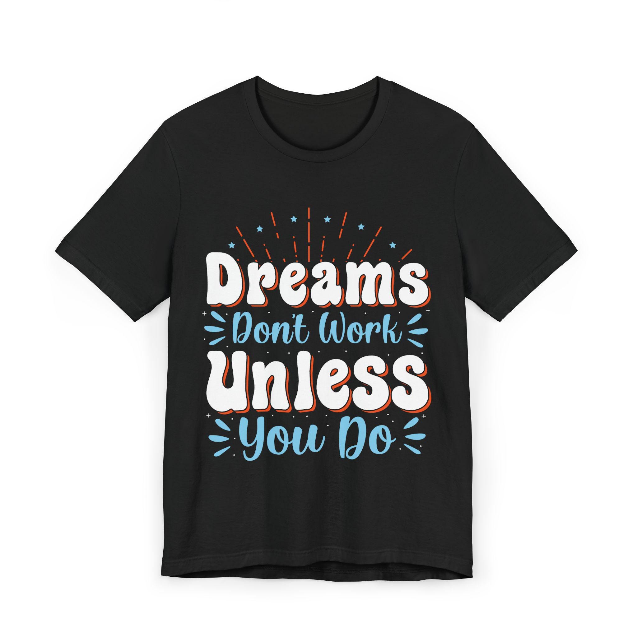 Achieve your dreams with this lightweight jersey tee featuring the inspiring hand-lettered mantra, “Dreams don’t work unless you do.” Whether you're planning your day, layering it under a denim jacket, or headed to a workout, this tee will give you the visual motivation you need. The rounded, upbeat lettering and playful marks exude a vintage and sincere feel, making it the perfect shirt to grab when you need a little momentum.