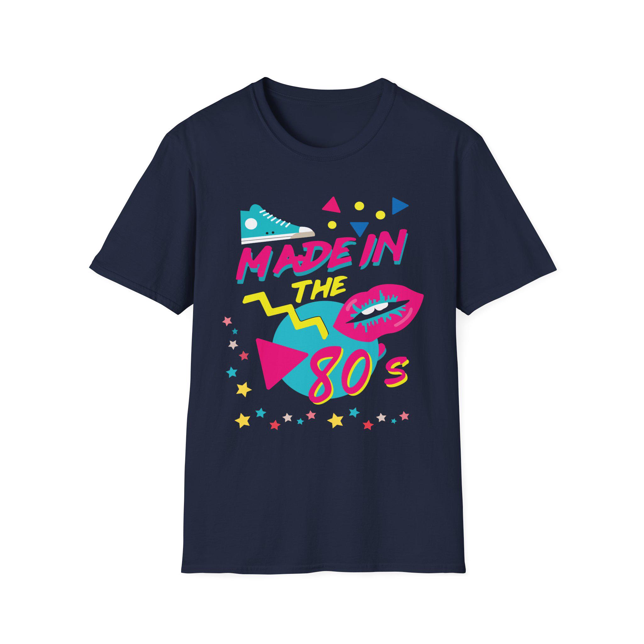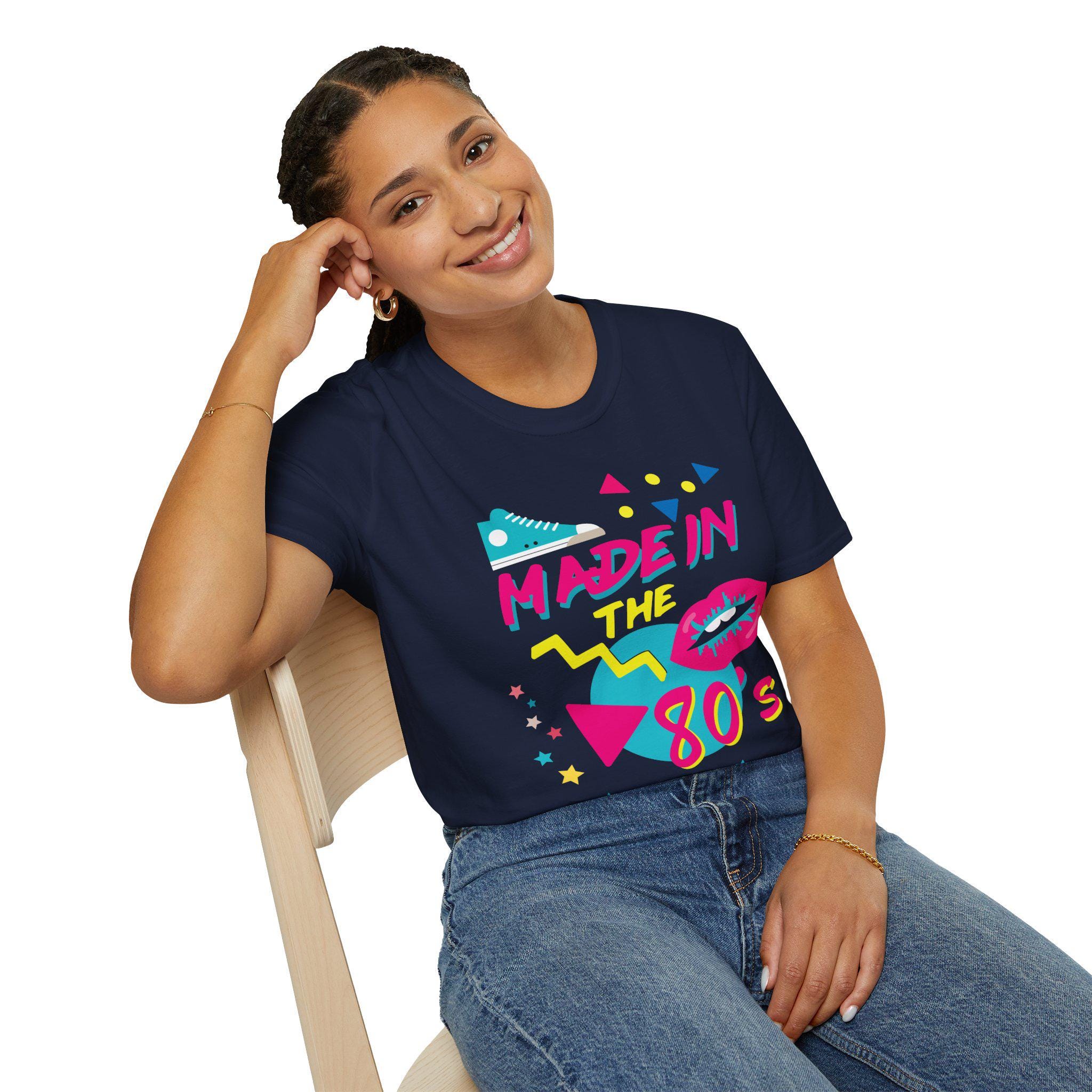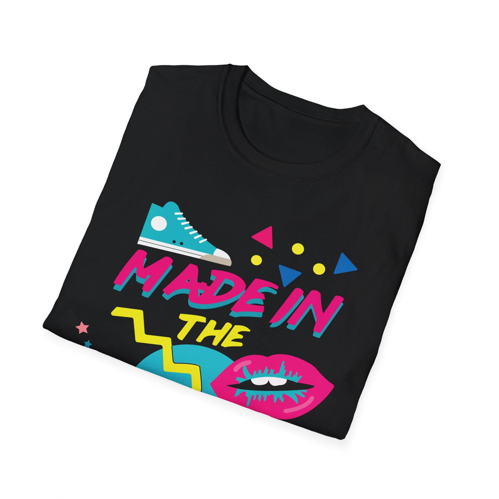 Neon nights and mixtape energy captured in a soft black tee. This shirt feels like stepping into an 80s arcade: bright cyan, magenta and yellow graphics pop against deep black, surrounding a hand-lettered “Made in the 80s” slogan. Bold geometric shapes, a retro sneaker and pop-art lips give it a playful, confident edge. Lightweight ring-spun cotton sits cool on the skin and breathes during long nights out or relaxed backyard hangs. The clean crew neckline and classic fit layer easily under jackets or stand on their own as a statement piece. Wear it when you want to channel vintage glow and nostalgia with a wink — movie nights, arcade runs, or any casual outing where bold color and playful attitude belong.